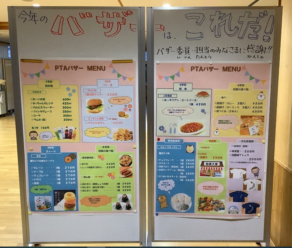 沼垂校の玄関には、写真のように、バザーのメニューが掲示されており、子どもたちが立ち止まって、じっくりと見入っています。申し込み期間は過ぎてしまいましたが、当日券でも購入できますので、ぜひ、大いに楽しんでほしいと思います。