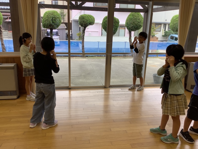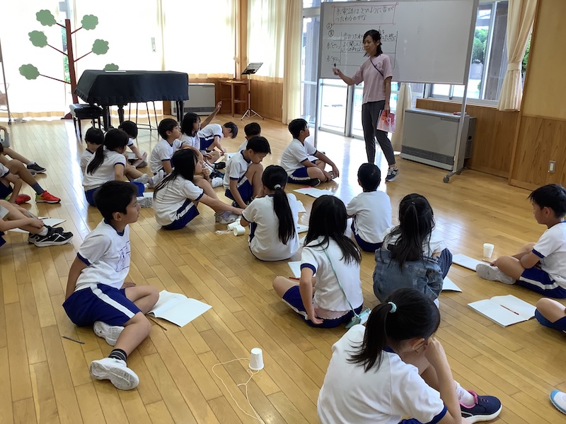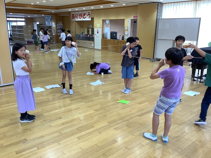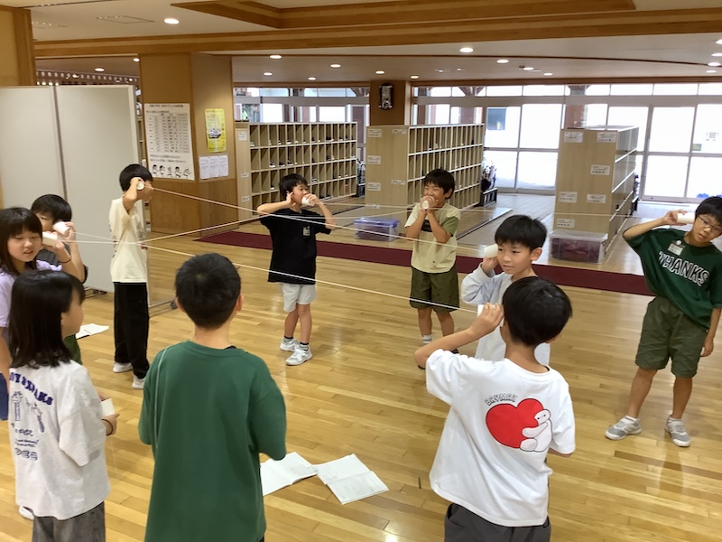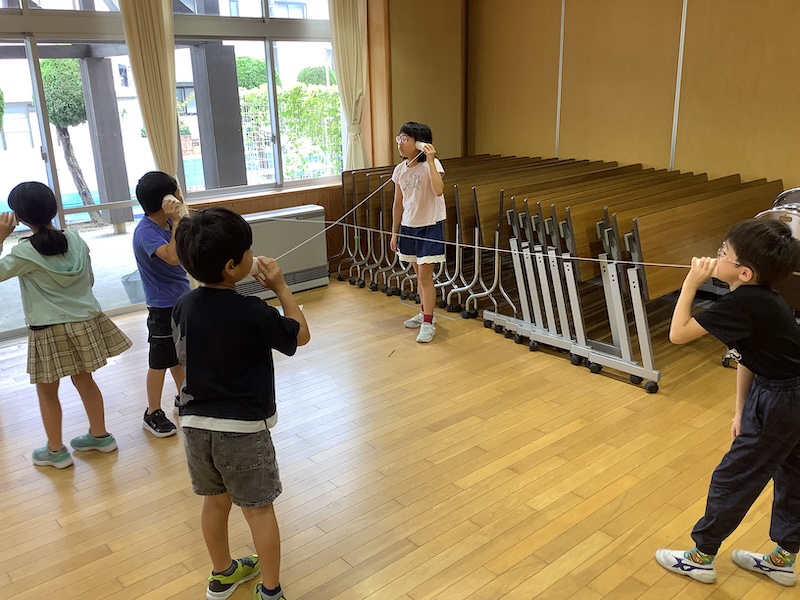 そんな子どもたちに、二つの紙コップを糸でつないだ「糸電話」を渡しました。これは、原理はシンプルですが、ある程度離れたところに音を伝えられる装置です。実際に離れた相手に声を届けたり声を聞いたりできるのか、早速試してみました。