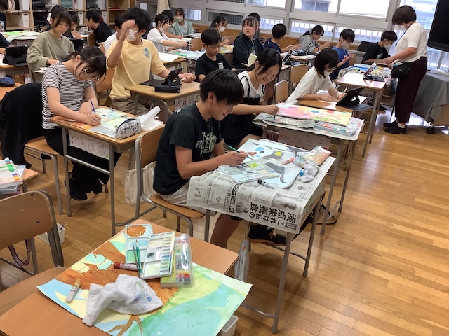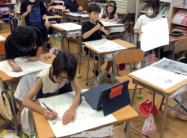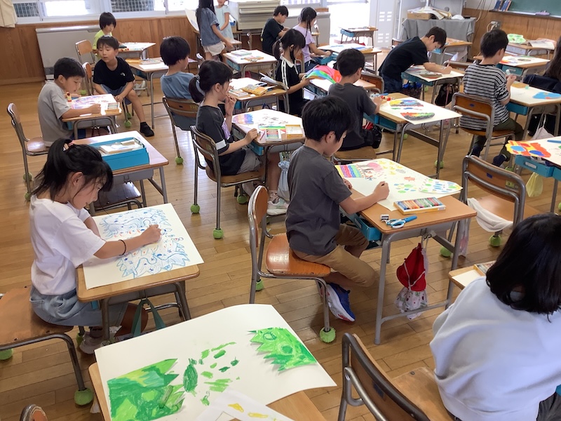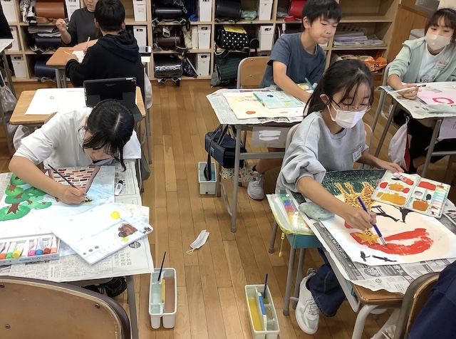 各学級で、図画工作で平面作品(いわゆる絵画)の制作を進めている場面を見掛けることが増えています。あと1か月後に文化祭があったり、絵画関係のコンクール出品もあったりするので、そのような時期だと想像できます。