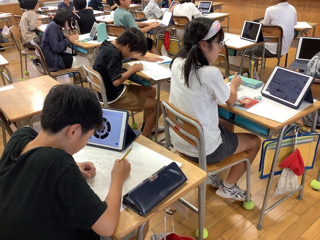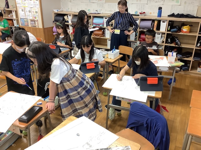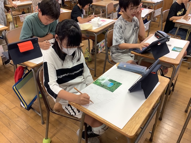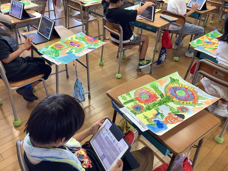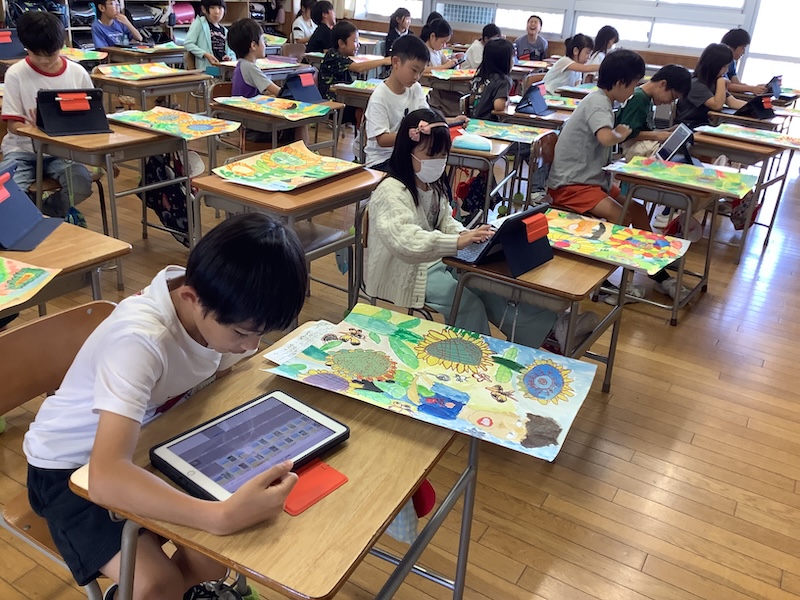 3年生は、理科で育てたひまわりとのコラボ作品でしょうか。もう仕上がっていて、作品をiPadで記録して、解説などを書き加えている子どもが多くいました。きれいな色彩が印象的でした。