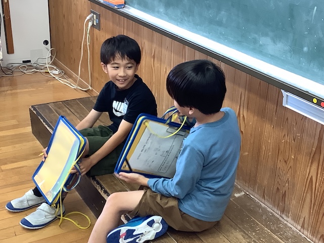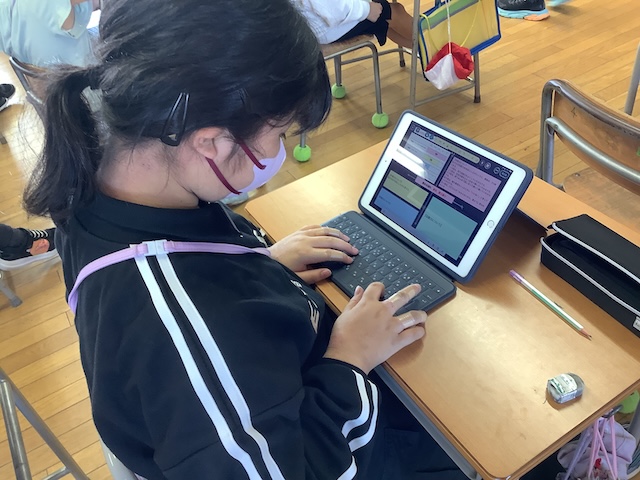 4年生は、単元(学習のまとまり)の終わりで振り返りをしていました。対話力、共感力、持続力、沼垂力の観点で点数を付け、言葉でその理由をiPadに入力していました。子どもによって点数やコメントは異なっており、自分のことをよく見つめて評価していることが分かりました。
