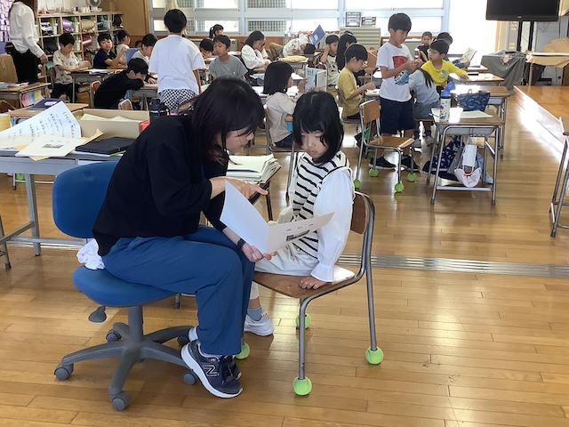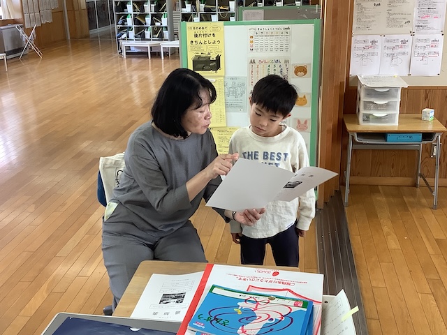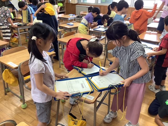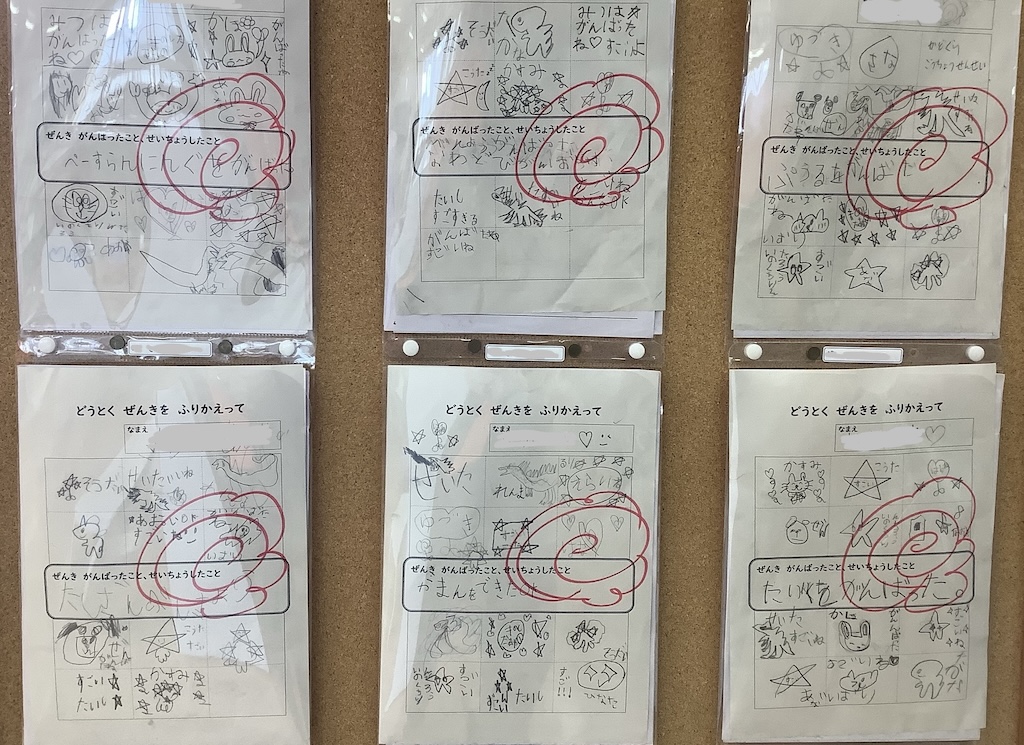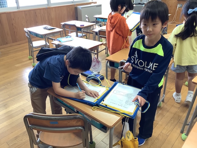 1年生では、道徳の時間を使い、これまでに頑張ったことを友達に伝えていました。4月の初めの頃の姿を思い出すと、自分の言葉で相手に思いを伝える力が育っていることを感じました。伝えることができたら、お互いの学習カードにサインを付けます。私も聞かせてもらったので、サインを書きました。
