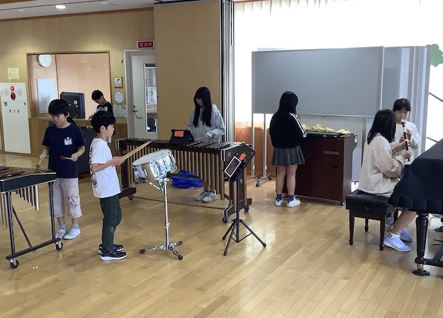 5年生は、6〜10人くらいで合奏をしています。「リボンのおどり(ラ バンバ)」の曲に乗って、様々な楽器が音を重ねていきます。音の重なりも楽しいのですが、5年生が声を掛け合い、タイミングを合わせながら試行錯誤して練習している姿が素敵です。
