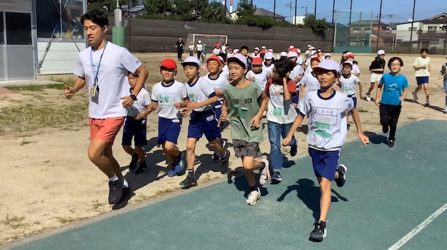 現在、グラウンドに四つのコースを設定していて、高学年であれば、1分間でちょうど1周走るには、どのくらいのペースにするとよいかを考えています。低学年であれば、3分間休まず気持ちよく走り続けてみようという感じで呼び掛けています。