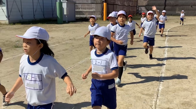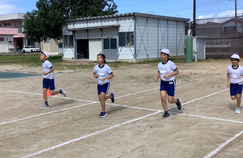 大会で、1、2年生は900m、3、4年生は1200m、5、6年生は1500mの距離を走ります。自分の記録や歴代の記録に挑戦することもありますが、学年及び男女別に順位も出すので、競走の要素もあります。