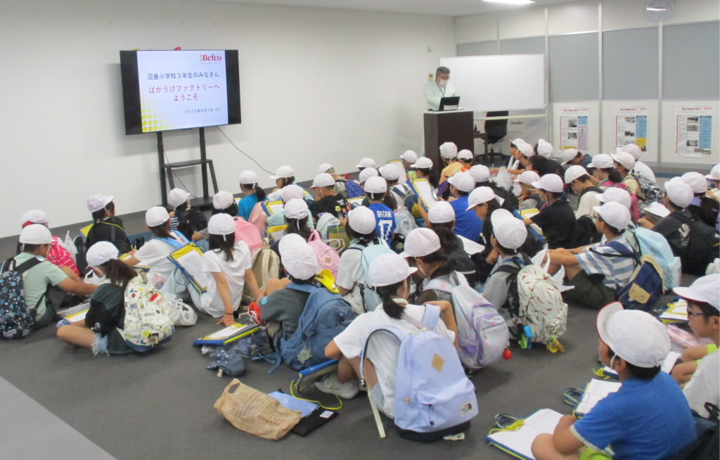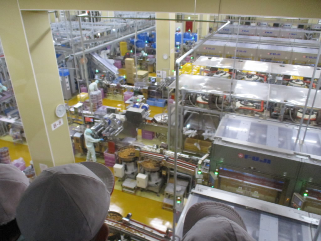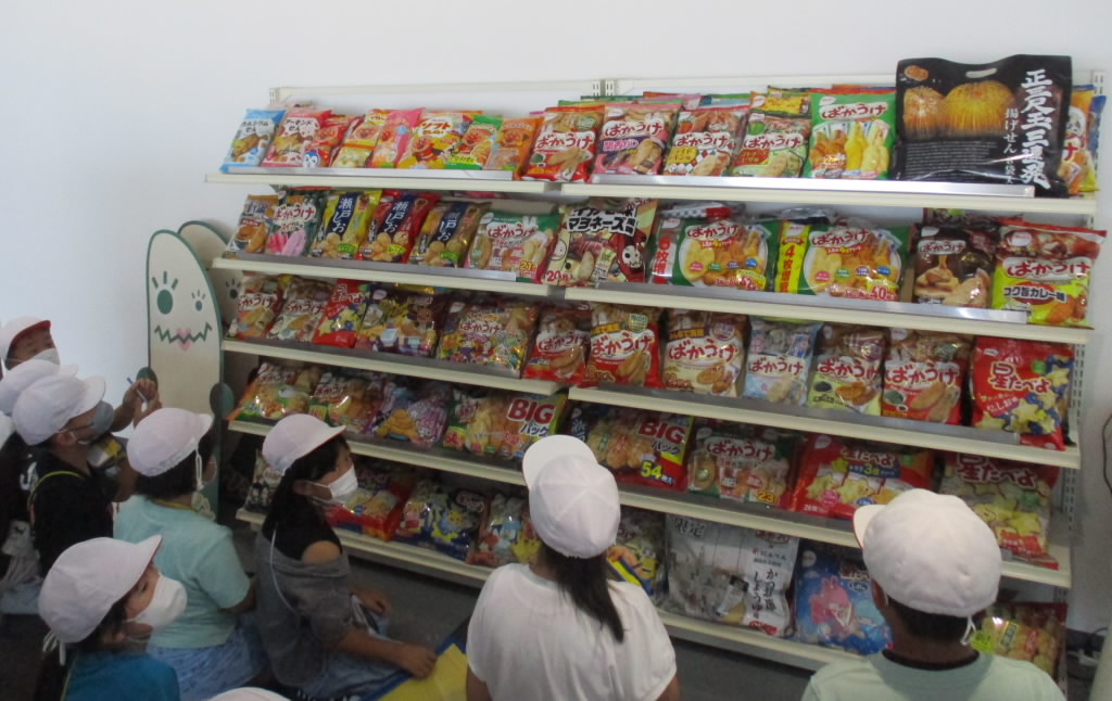 1カ所目は、北区の栗山米菓「ばかうけファクトリー」です。工場で商品を作る工程やそこで働いている人の仕事の様子を見て学ぶことが目的です。工場の大きさや設備機械の多さ、「ばかうけ」のラインナップの多さに子どもたちはびっくりしていました。