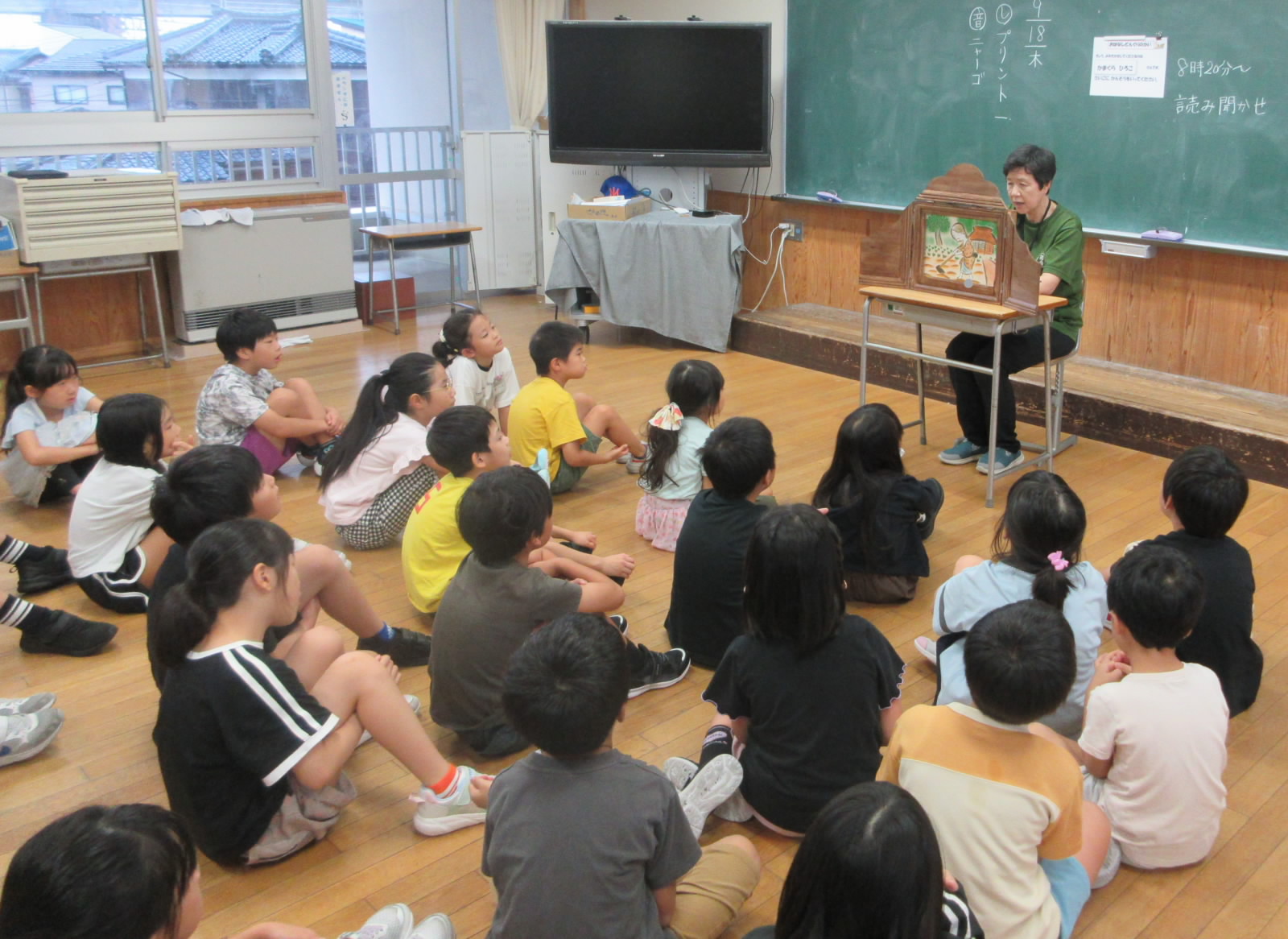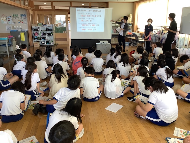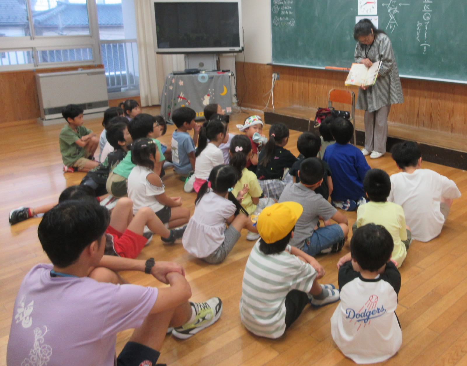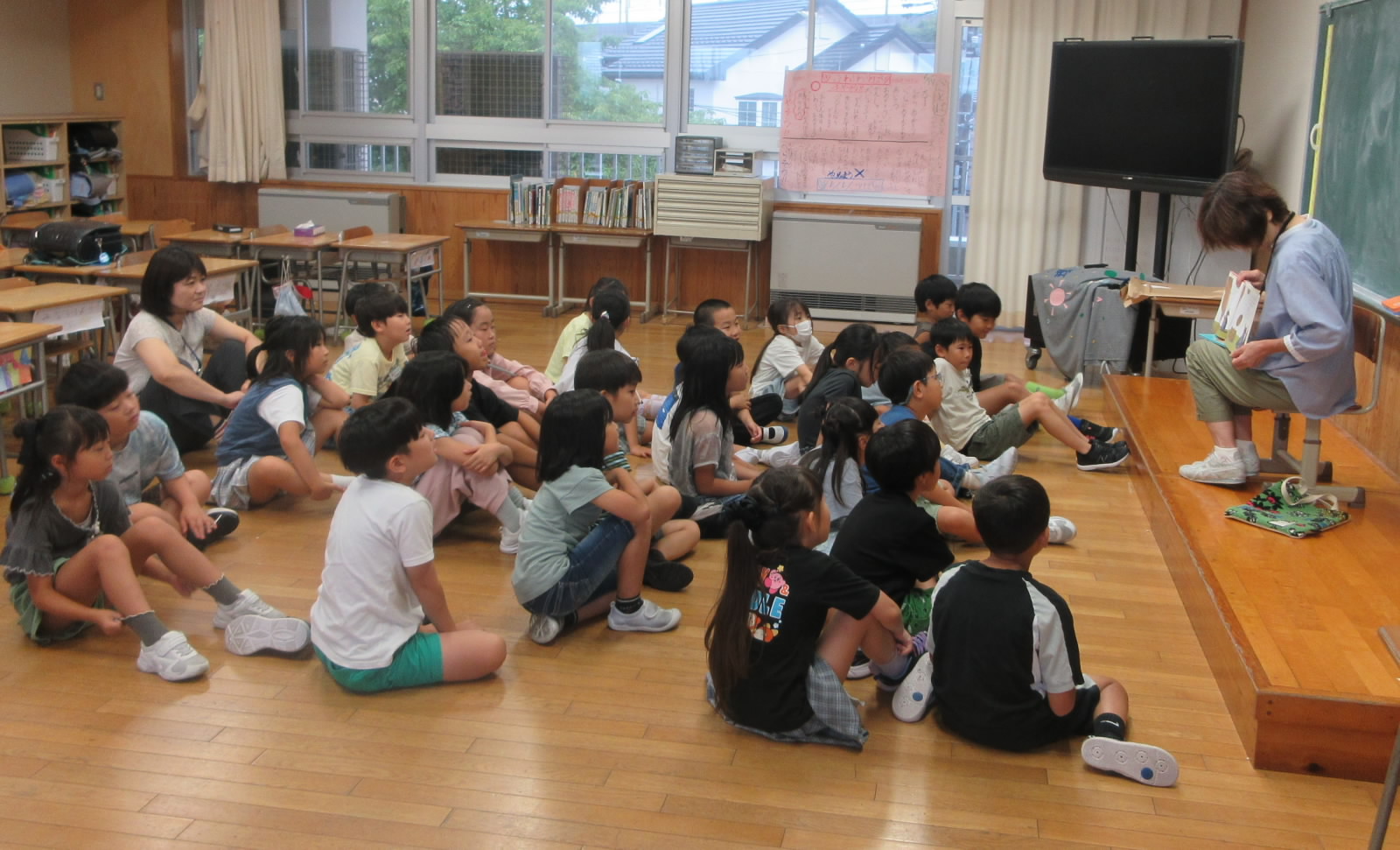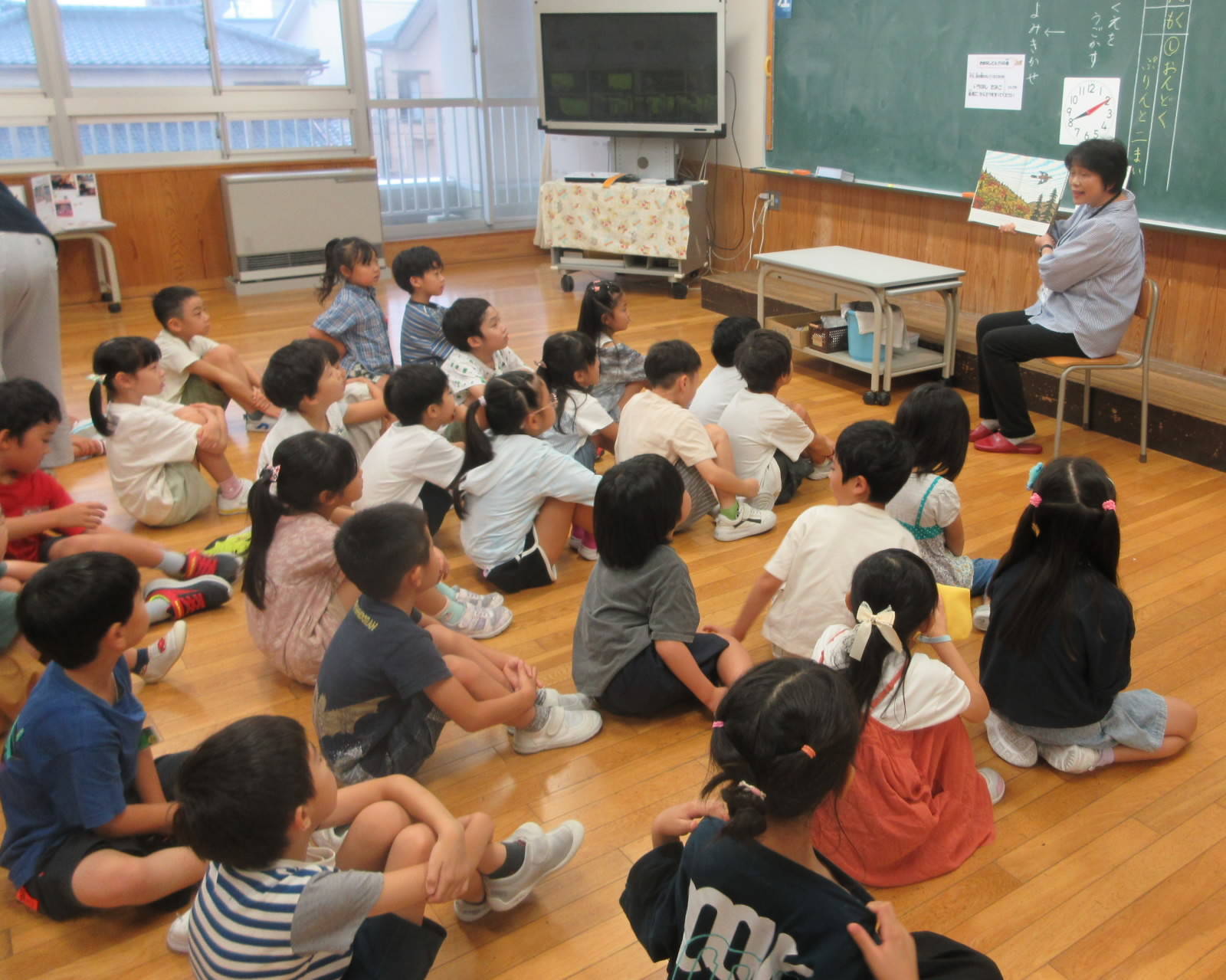 今日は朝の読み聞かせの日でした。お話どんぐり(サークル名)のボランティアの皆様から、絵本を中心にお話を聞かせてもらいました。