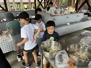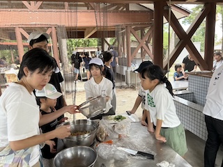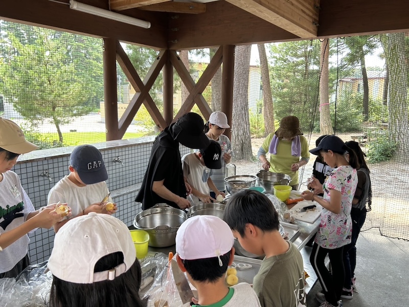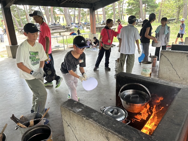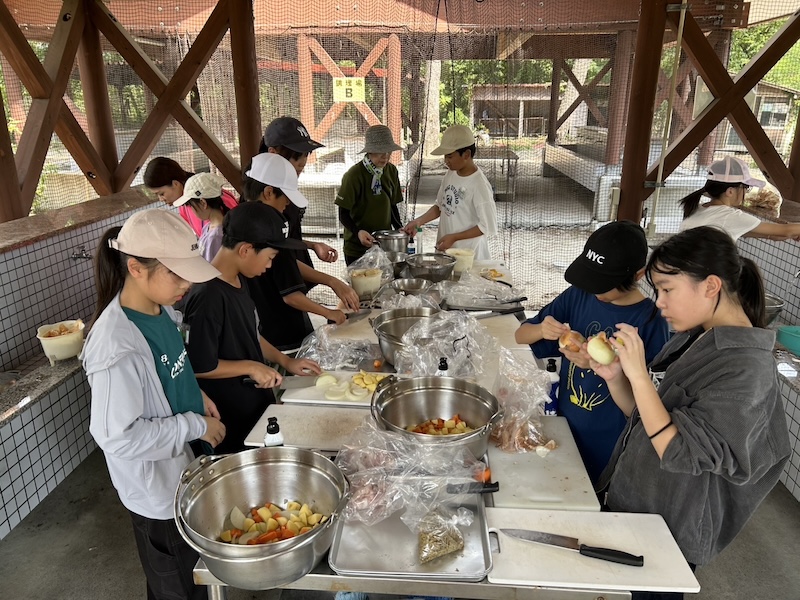 入所式の後の最初の活動が野外炊さんです。今回はカレーライスを作りました。野外で材料を切ることやかまどに薪をくべて火を起こすことなど、野外活動の経験が少ない子どもたちにとって、貴重な体験の時間になっています。