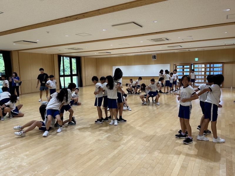 その中で、職員が体を張って研修したのが、体育実技講習会です。授業マイスターの竹松譲教諭が講師となり、参加者は様々な授業アイディアやコツを学びました。職員同士がグループになって写真のように動きを試したり相談したりしていると、自然に笑顔がたくさん生まれていました。