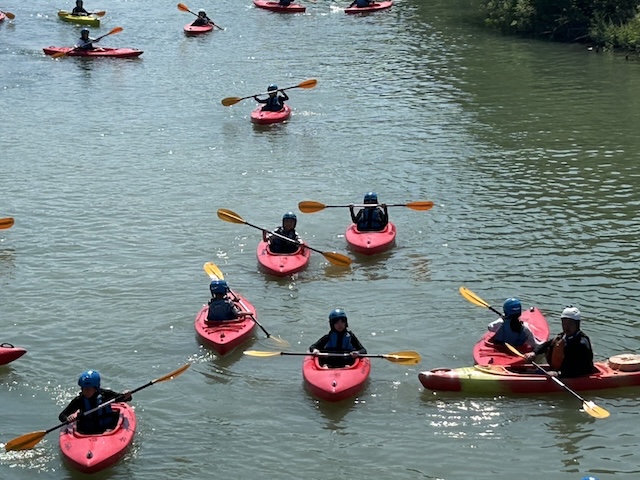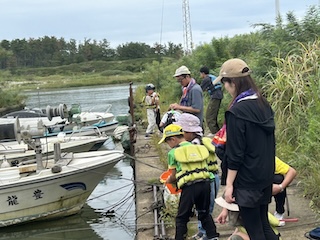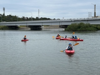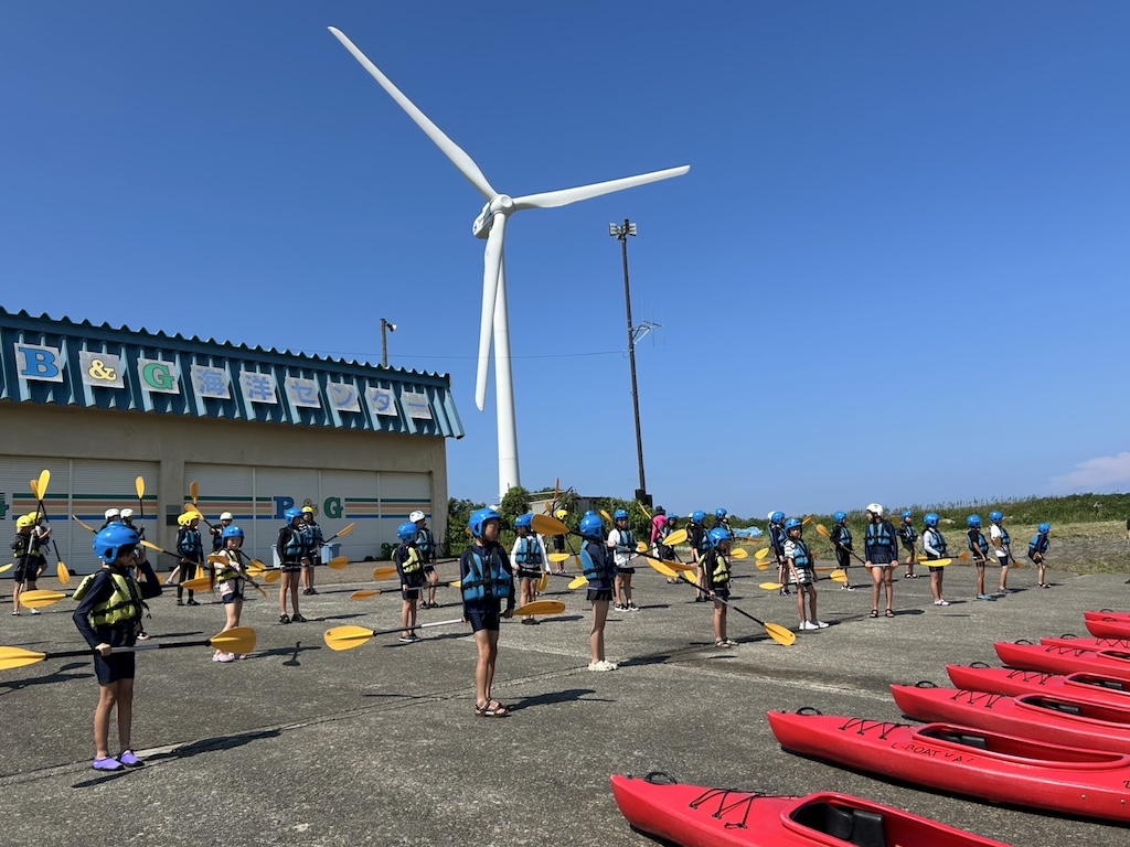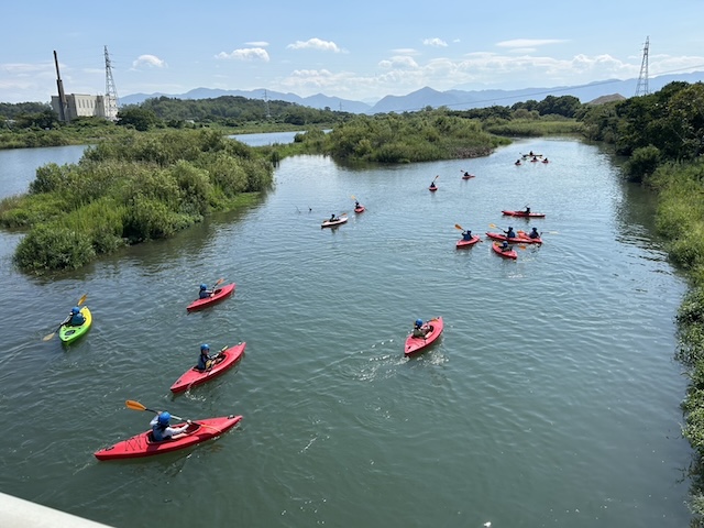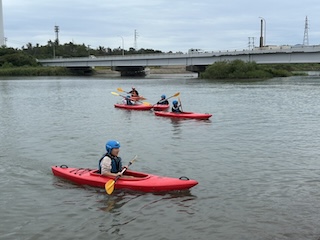 自然の家の指導員からカヌーのコクピットへの入り方、パドルの扱い方などを教えてもらい、子どもたちはあっという間に上達していきました。とても気温が高い中ではありましたが、海と川から寄せる風が爽やかで心地よく、いい気分でカヌーを進めました。