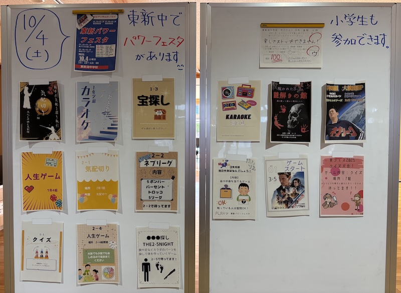 さて、6年生の多くが進学する東新潟中学校では、今週末に生徒会主催の東新パワーFESTAがあるそうです。沼垂校にも宣伝チラシが大量に来たので、児童玄関前に掲示ました。すると、子どもたちは、それらに目が釘付けでした。