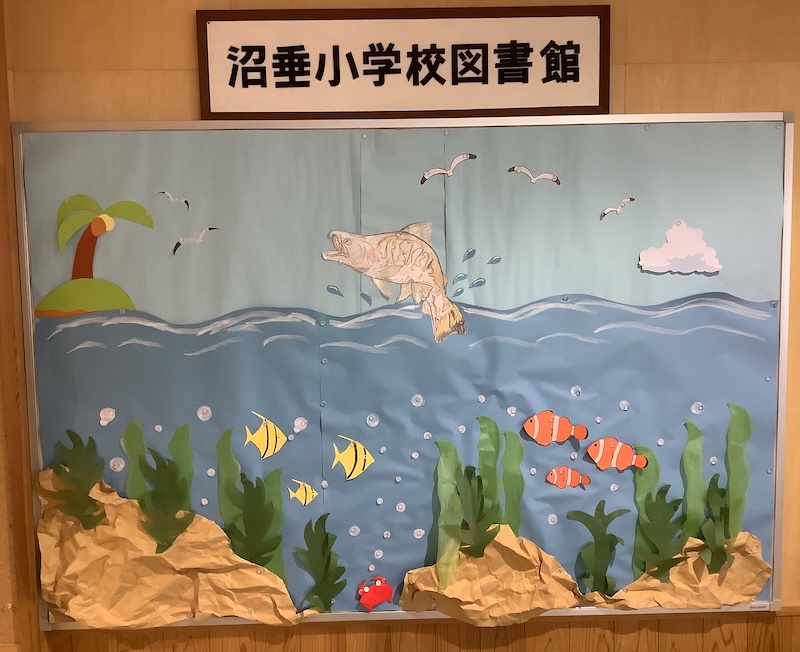 図書館の掲示板は水辺をモチーフにしたデザインで飾っていました。夏のイメージです。