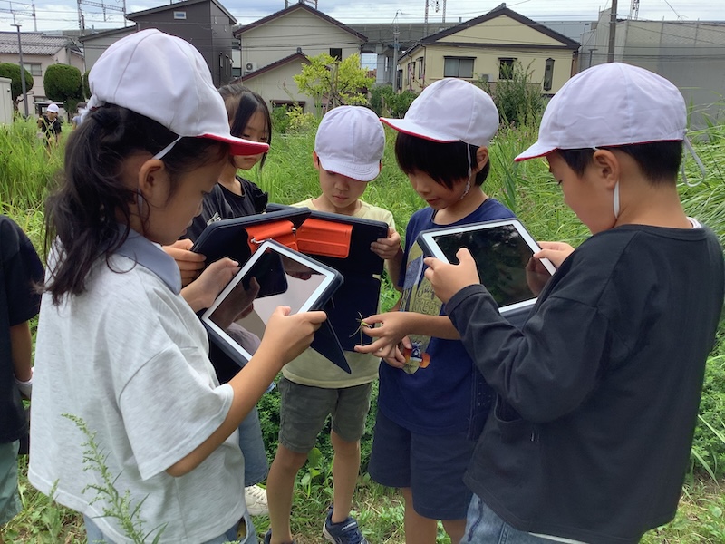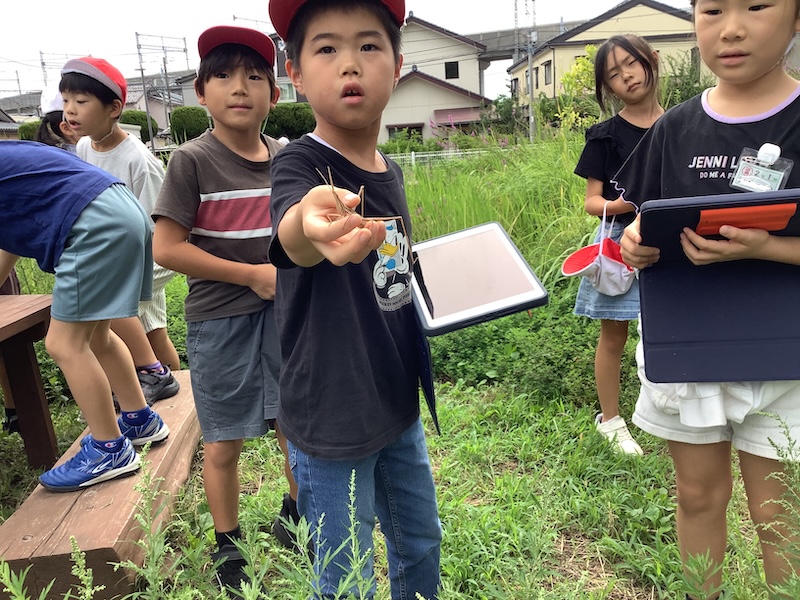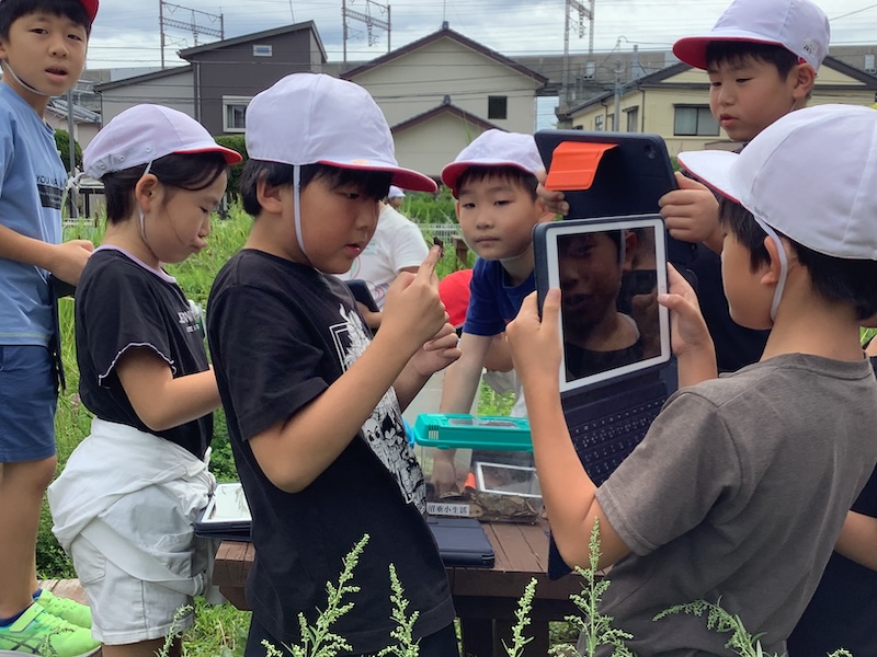 沼垂校には、たくさんの動植物がいます。生き物カゴや飼育ケースなどを持った子どもが、休み時間に捕まえた生き物をそこに入れて楽しんでいます。