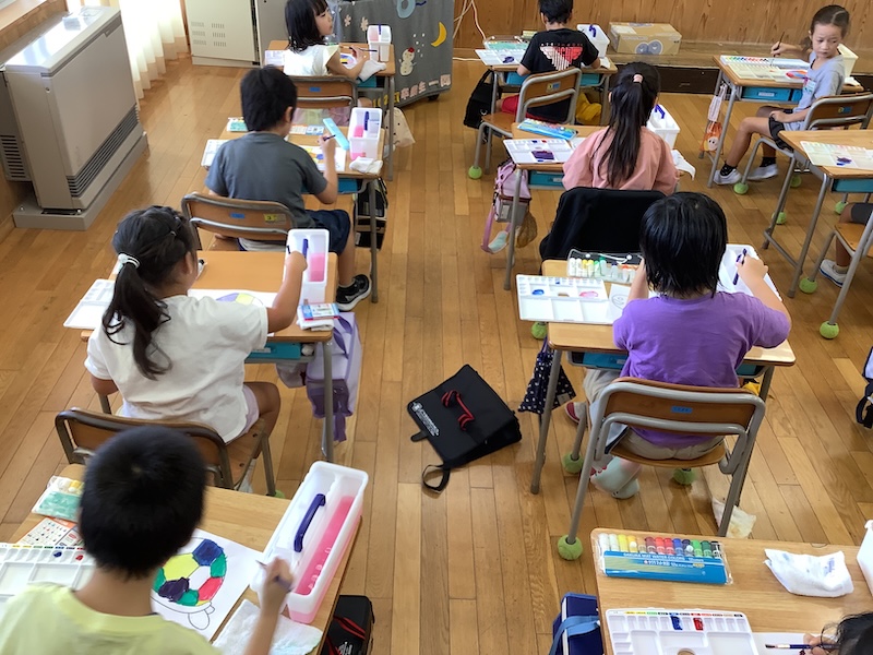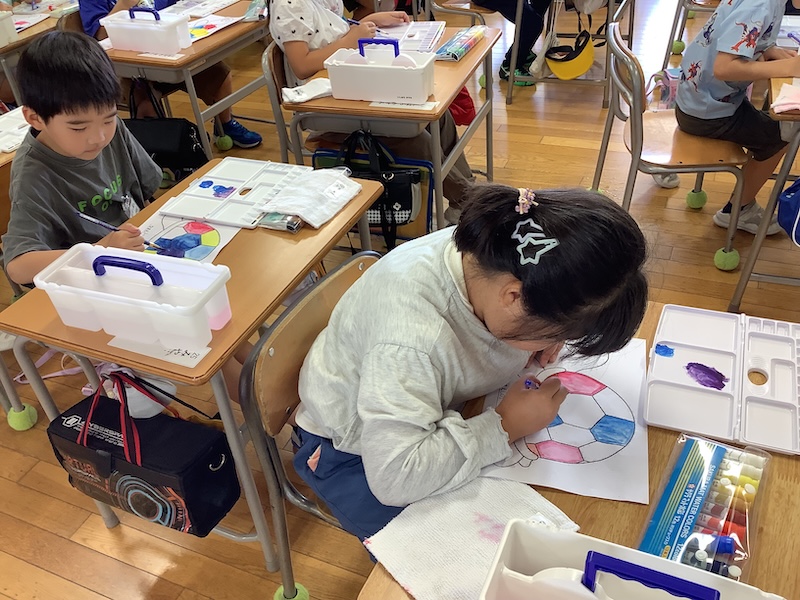1年生は、絵の具を一人一人が使い始めました。絵の具やパレット、水入れなどを試しながら、筆で色を着けていきます。