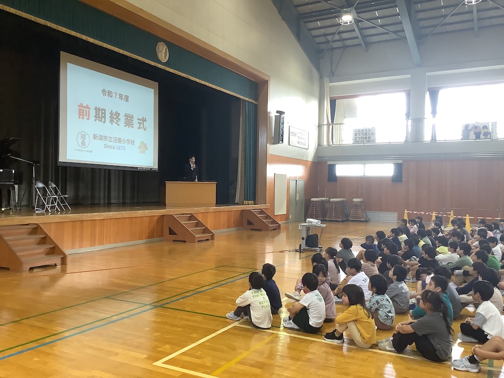 全校集会では、子どもたちが暑さに負けず、元気に校歌を歌ったり、校長の話を真剣に聴いたり、陸上競技記録会の代表選手に精一杯のエールを送ったりしました。子どもたちの伸び伸びとした様子に、取材に来ていたTENY(テレビ新潟)のクルーもさぞ驚いたことでしょう。